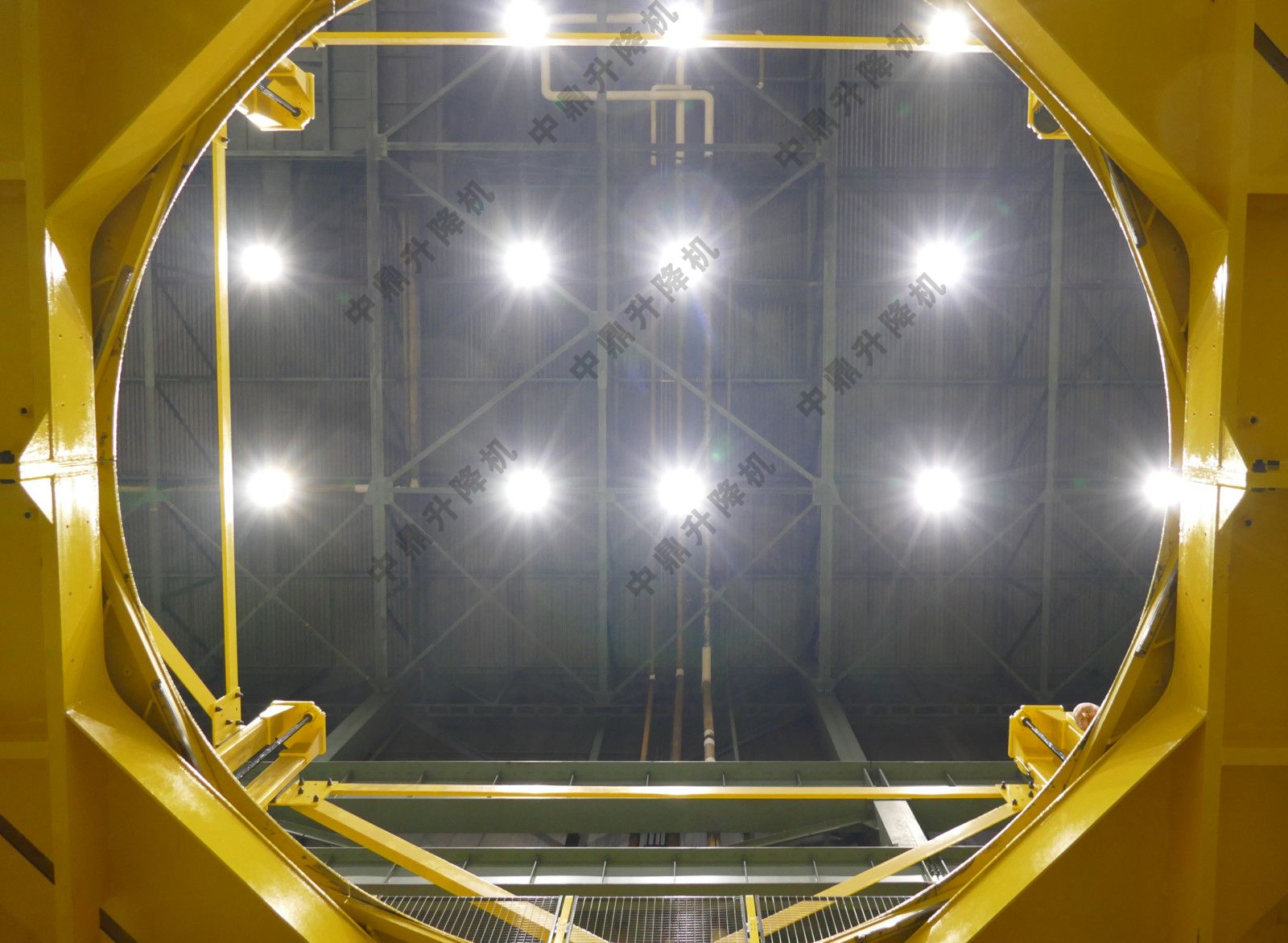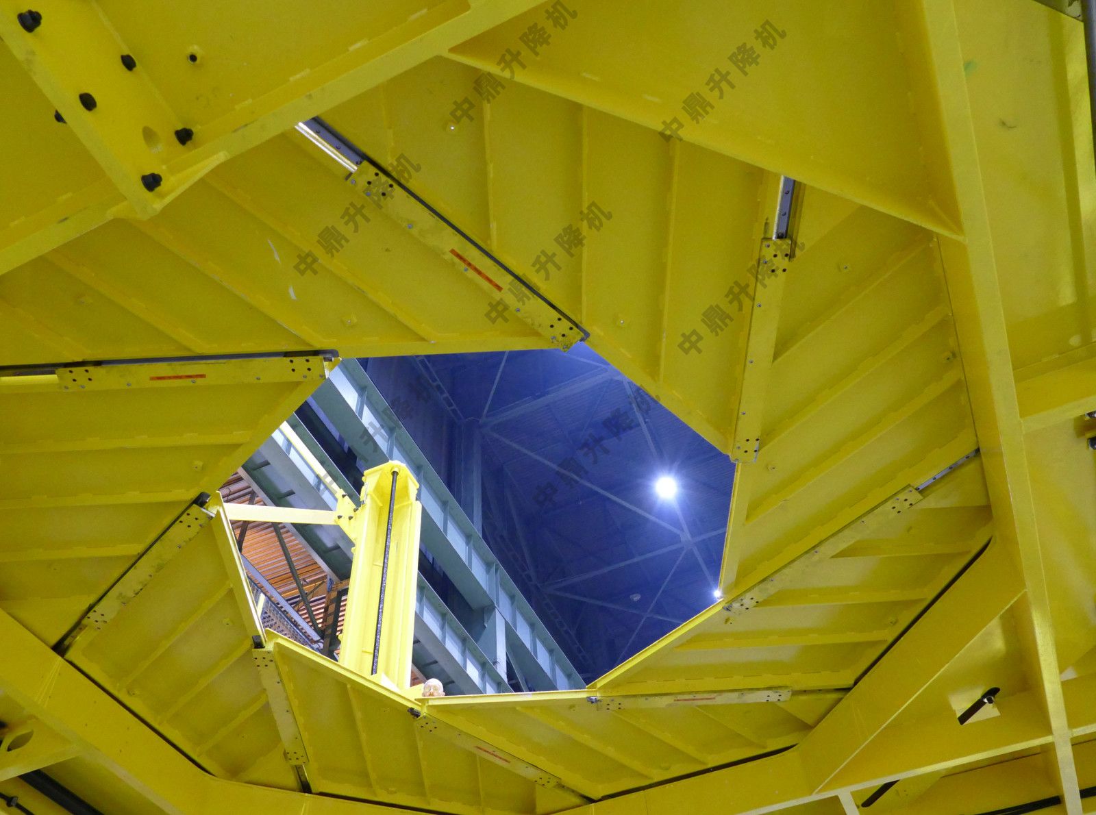 平臺和樓梯組件的升降是通過放置在每個角柱上的四個滾珠絲杠驅動的,每個滾珠絲杠由強大的電機驅動,每個滾珠絲螺釘彼此機械同步。中央光圈開啟驅動是液壓的。