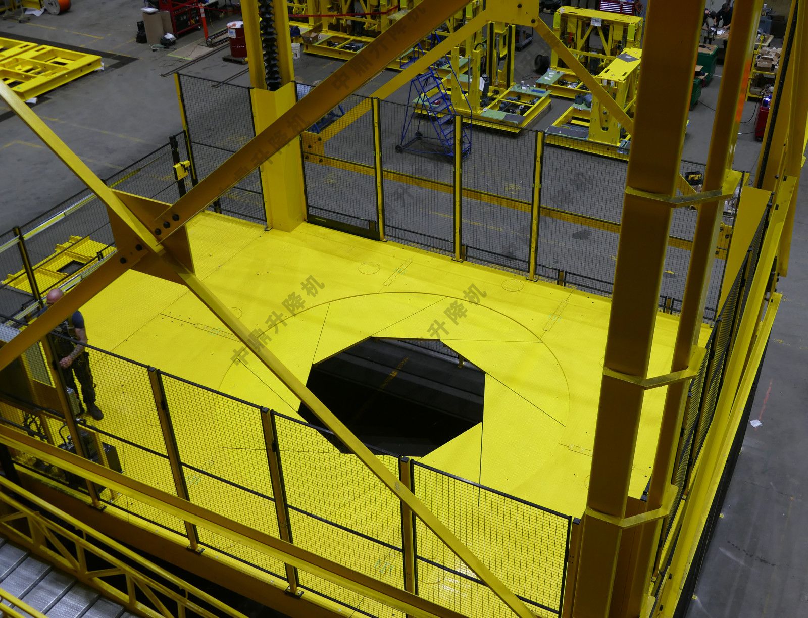 這種定制設計的垂直裝配平臺將用于在大型渦輪機建造過程中將技術人員定位在正確的高度和位置。該組件獨特的虹膜開口允許在產品直徑周圍進行特殊放置,以便將渦輪機構建出來。